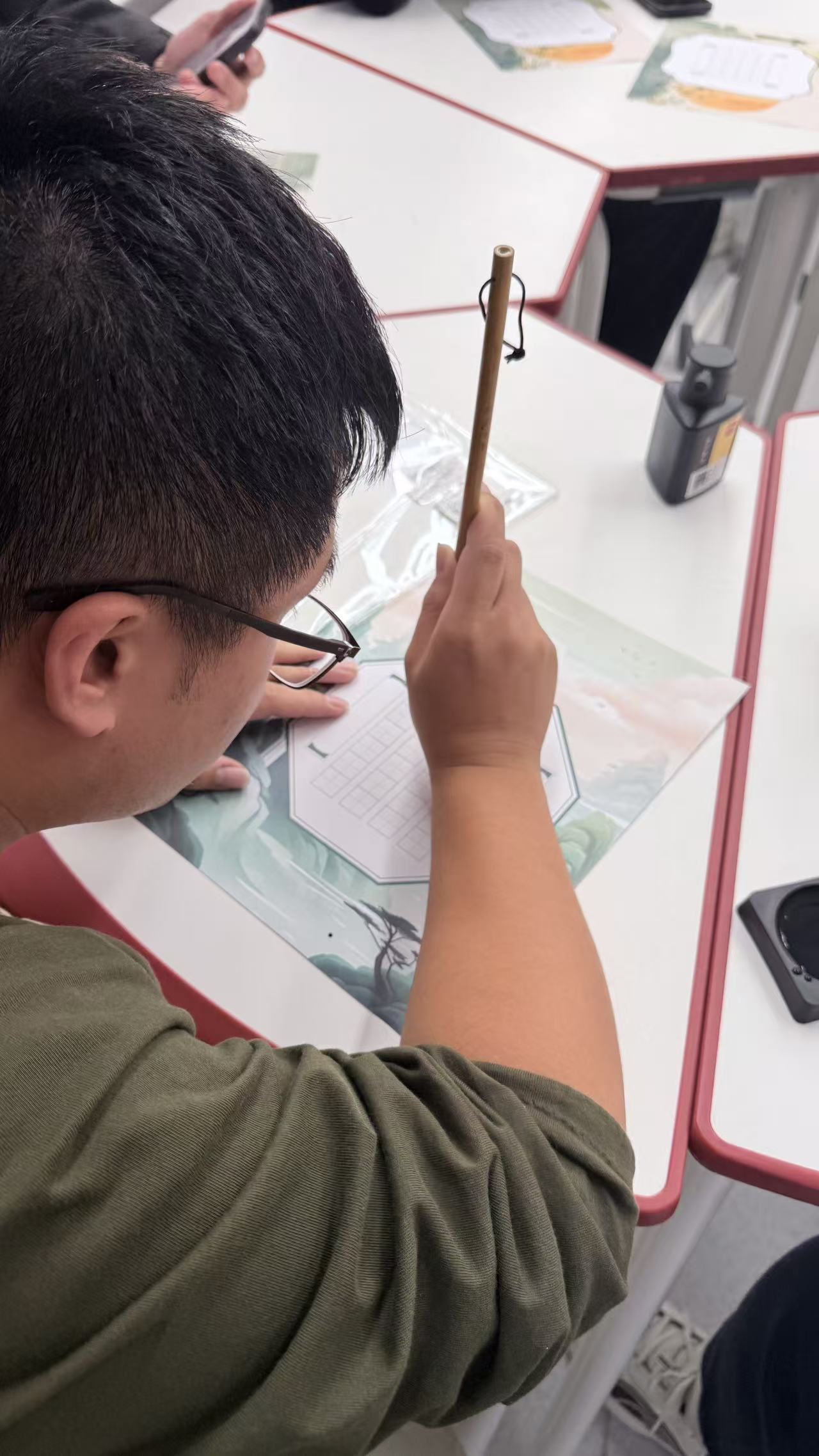 “传文润心,学风筑梦”传统书法活动现场,同学们围坐一堂,眼眸里满是期待与热忱,大家紧扣传统书法主题,各展巧思与才情,让中华笔墨之美在宣纸上流转绽放。经典规整款作品尽显庄重,有的同学以楷书挥毫,将“书山有路勤为径”的治学箴言书写得笔力遒劲,墨香中裹挟着崇文向学的气韵。灵动写意款作品活力满满,同学们打破常规,将书法艺术与青春感悟巧妙融合,行书笔下的“少年意气当拿云”、草书挥洒的“乘风破浪会有时”,让传统书法变得灵动又富有朝气。大家用不同书体搭配创作,将篆书的古拙、行书的流畅、楷书的端庄巧妙交织,或在笔墨间点缀淡雅梅枝、竹影,每一处笔画与布局都藏着对书法艺术的细致揣摩,既展现了扎实的笔墨功底,更传递出对传统文化的热爱与创新表达。